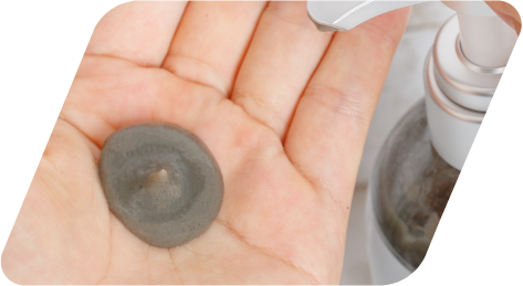 ①シャンプーがよく泡立つように、髪と頭皮を十分に濡らしたら、シャンプー液(適量)を手のひらに取ってしっかりと泡立てながら汚れを落とします。